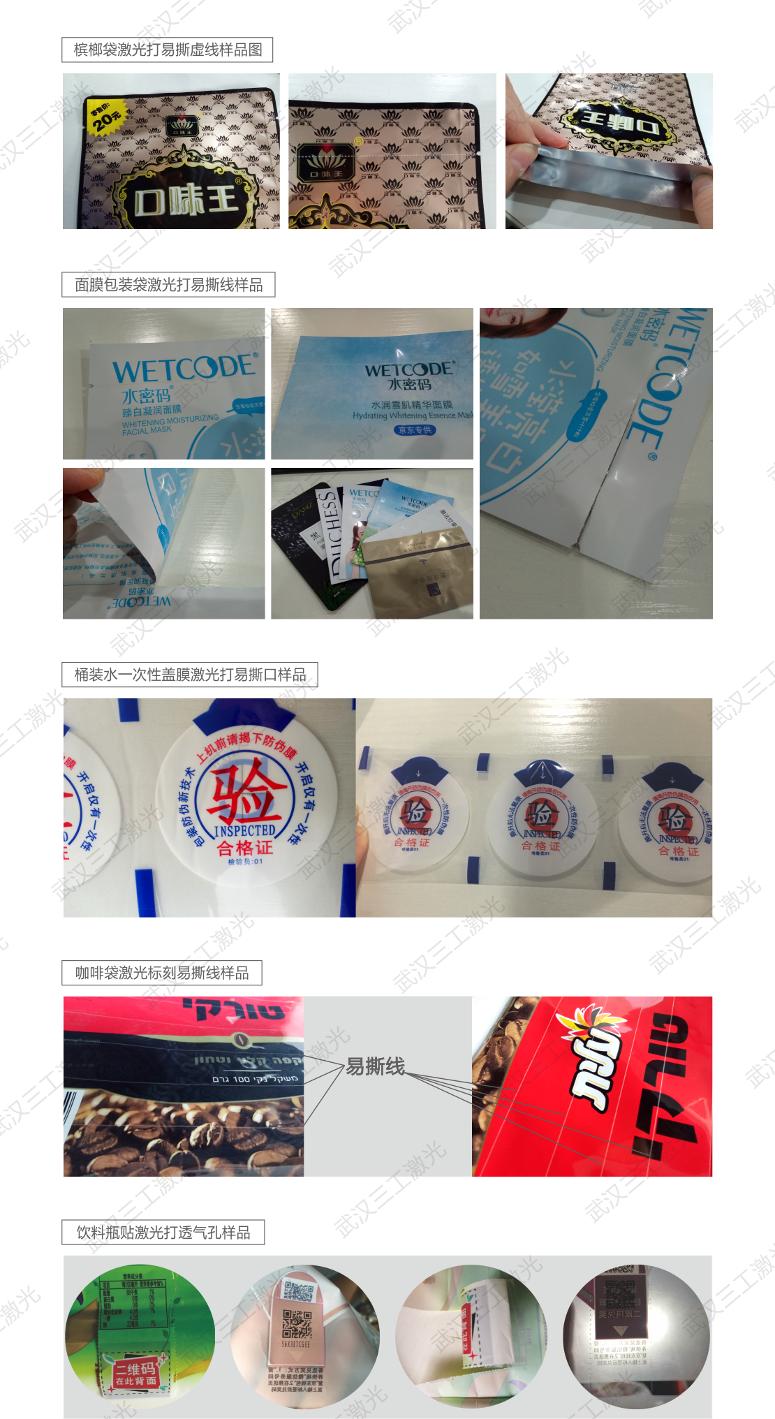 武漢三工激光是國內(nèi)率先針對薄膜包裝行業(yè)提出激光代替機(jī)械加工工藝的企業(yè),專為薄膜易撕線、定量透氣孔而設(shè)計(jì)與開發(fā)的。與傳統(tǒng)的機(jī)械齒輪壓孔相比速度更快,孔徑孔距大小可調(diào)更加均勻,可以實(shí)現(xiàn)任意方向任意形狀易撕孔(線)標(biāo)刻。激光工藝制作是一種瞬間高溫處理使孔周圍熱融保護(hù),因此完全解決了后期熱收縮后出現(xiàn)的斷裂現(xiàn)象,在手感上也非常平滑,在感官上給客戶一種新的體驗(yàn)。激光易撕線和透氣孔的諸多優(yōu)勢我們前面已經(jīng)講到過很多,再次不做贅述,下面一起來看一下我們易撕線激光打孔劃線機(jī)做的不同行業(yè)以及材料的樣品吧!