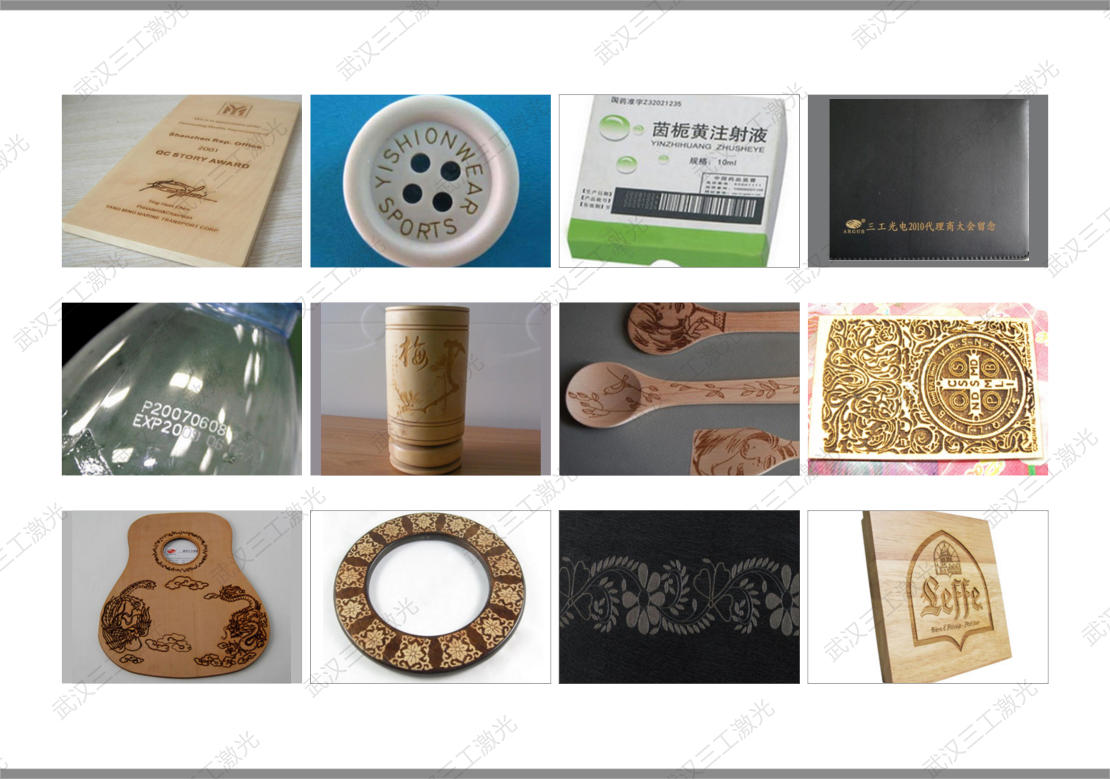 絕大部分非金屬材料、如皮革、布料、木器、竹器、紙張、有機(jī)材料、亞克力等 。